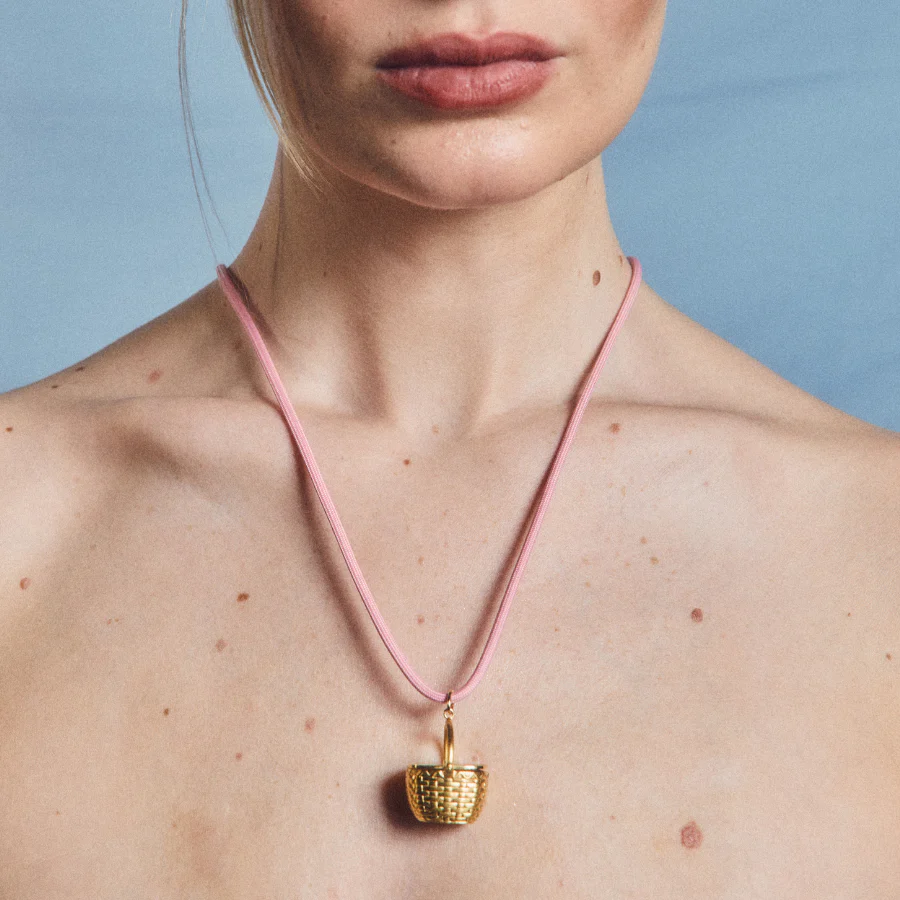 This necklace features our Basket Vesta Case on our Sherbet Pink Necklace Cord.